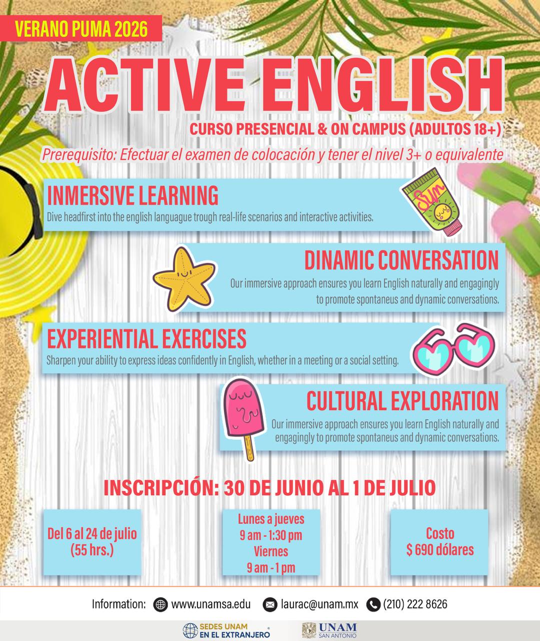 Active English: Experiencia de inmersión 100% presencial en campus, exclusiva para adultos de 18 años en adelante. Como requisito, se debe presentar un examen de colocación y obtener nivel 3 o superior. Las inscripciones serán el 30 de junio y 1 de julio. Las clases, que suman 55 horas, serán del 6 al 24 de julio con horario de lunes a jueves de 9:00 am a 1:30 pm y los viernes de 9:00 am a 1:00 pm. El costo es de 690 dólares.
