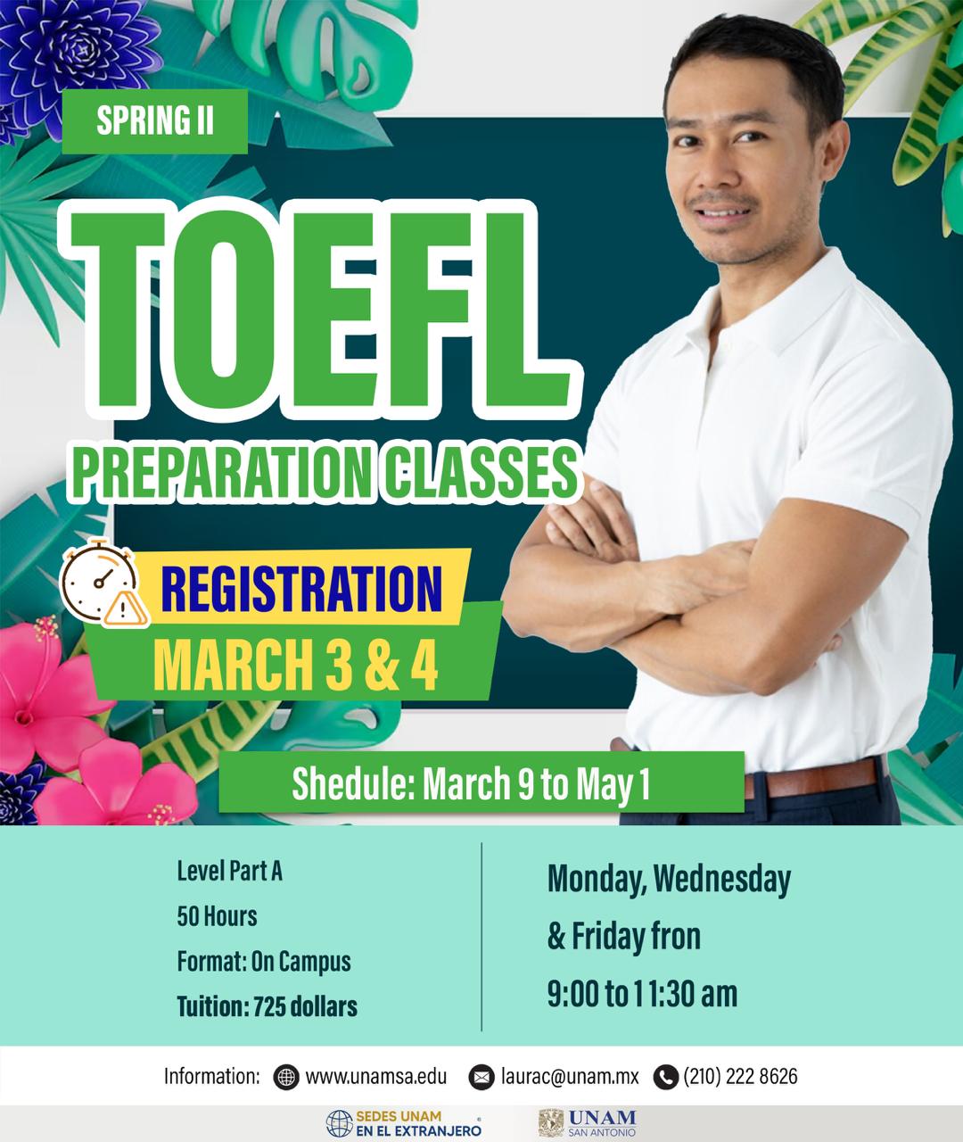 TOEFL Preparation Classes: Entrenamiento enfocado de 50 horas presenciales. Se lleva a cabo los lunes, miércoles y viernes de 9:00 a 11:30 am, terminando el 1 de mayo. El costo es de 725 dólares.