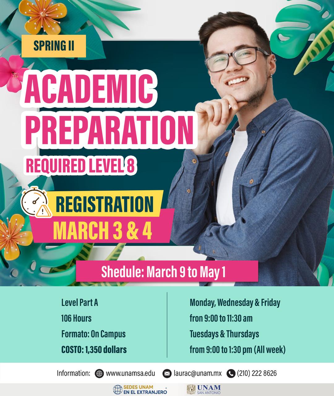 Academic Preparation: Orientado a estudiantes que requieren inglés para fines académicos de alto nivel. Es indispensable contar con nivel 8. Consta de 106 horas presenciales con el mismo horario matutino del curso intensivo, hasta el 1 de mayo. El costo es de 1,350 dólares.