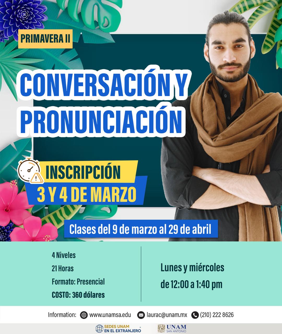 Conversación y Pronunciación: Práctica intensiva presencial de 21 horas, dividida en 4 niveles. Se imparte los lunes y miércoles de 12:00 a 1:40 pm, finalizando el 29 de abril. El costo es de 360 dólares.