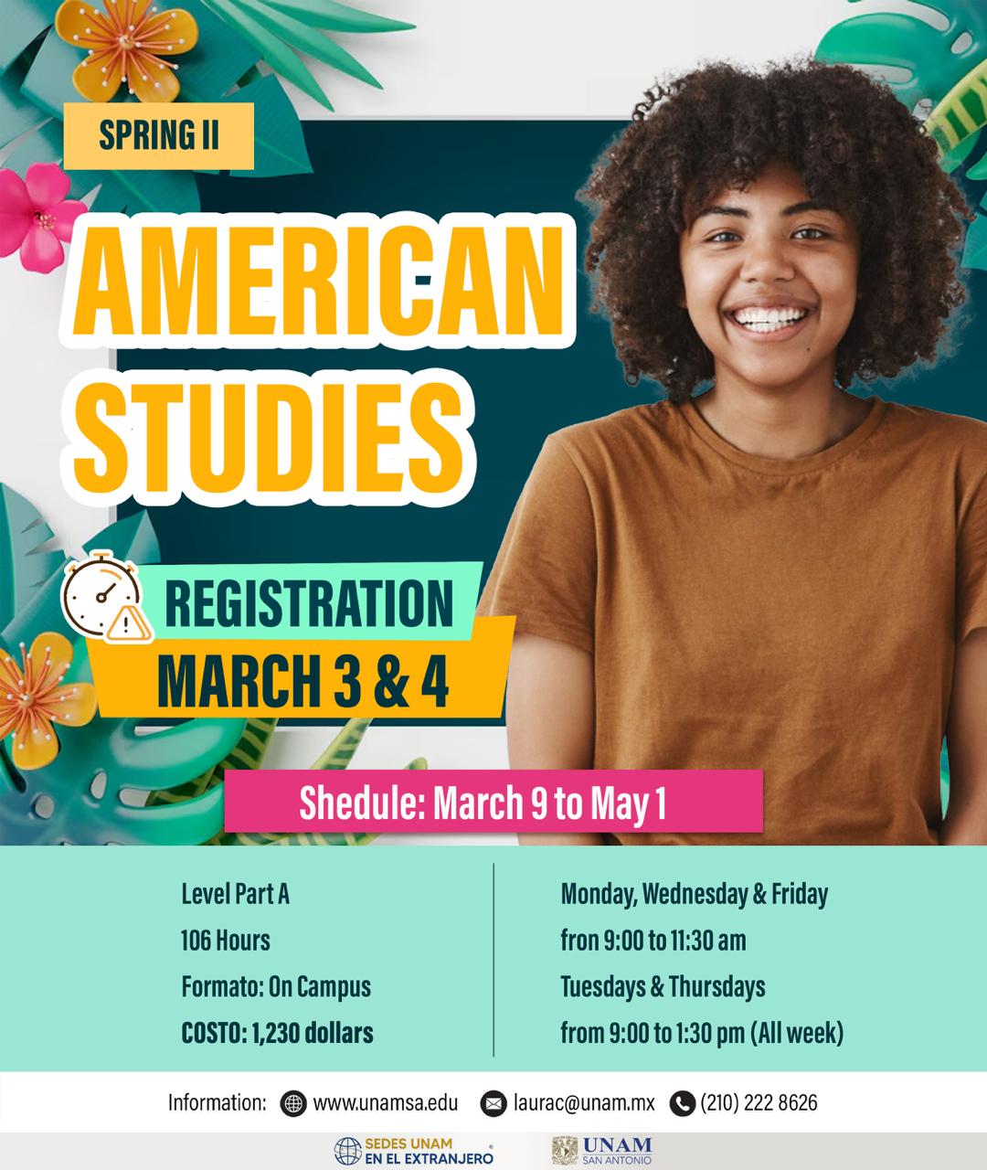 American Studies: Curso presencial de 106 horas enfocado en el aprendizaje a través de la cultura, con el mismo horario matutino intensivo de toda la semana, finalizando el 1 de mayo. El costo es de 1,230 dólares.
