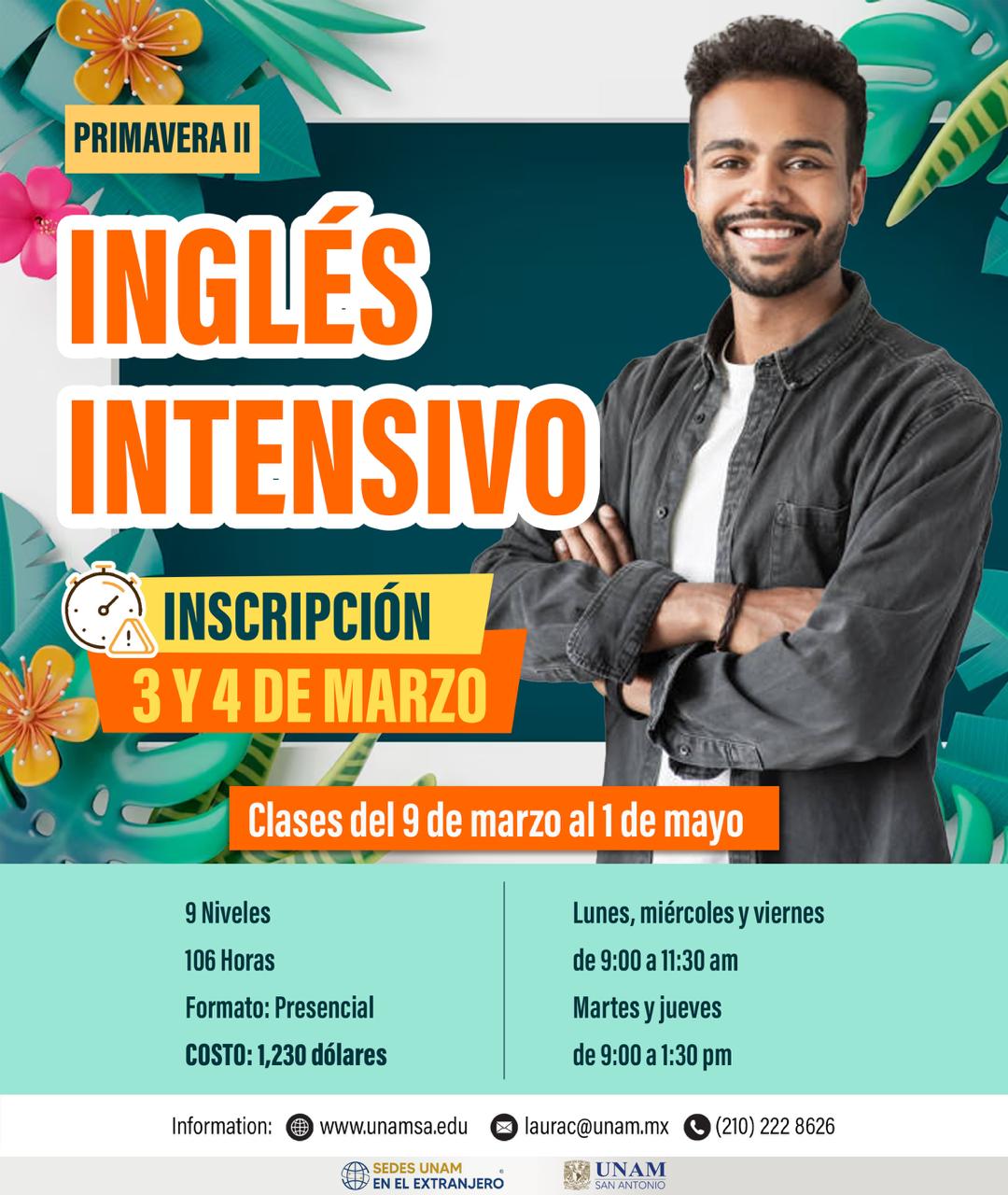 Inglés Intensivo: Programa presencial de 106 horas que abarca 9 niveles. Las clases se imparten de lunes, miércoles y viernes de 9:00 a 11:30 am, y martes y jueves de 9:00 a 1:30 pm, concluyendo el 1 de mayo. El costo es de 1,230 dólares.