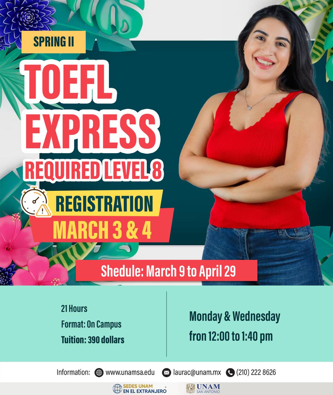 TOEFL Express: Preparación acelerada de 21 horas para la cual se requiere nivel 8. Las sesiones son presenciales los lunes y miércoles de 12:00 a 1:40 pm, hasta el 29 de abril. El costo es de 390 dólares.