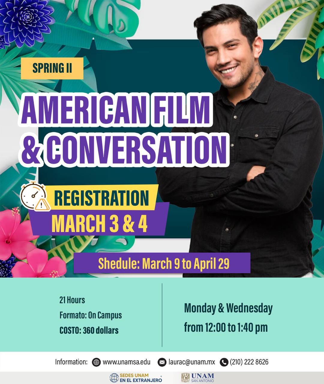 American Film & Conversation: Análisis y debate cinematográfico en formato presencial de 21 horas. Las clases son los lunes y miércoles de 12:00 a 1:40 pm, concluyendo el 29 de abril. El costo es de 360 dólares.